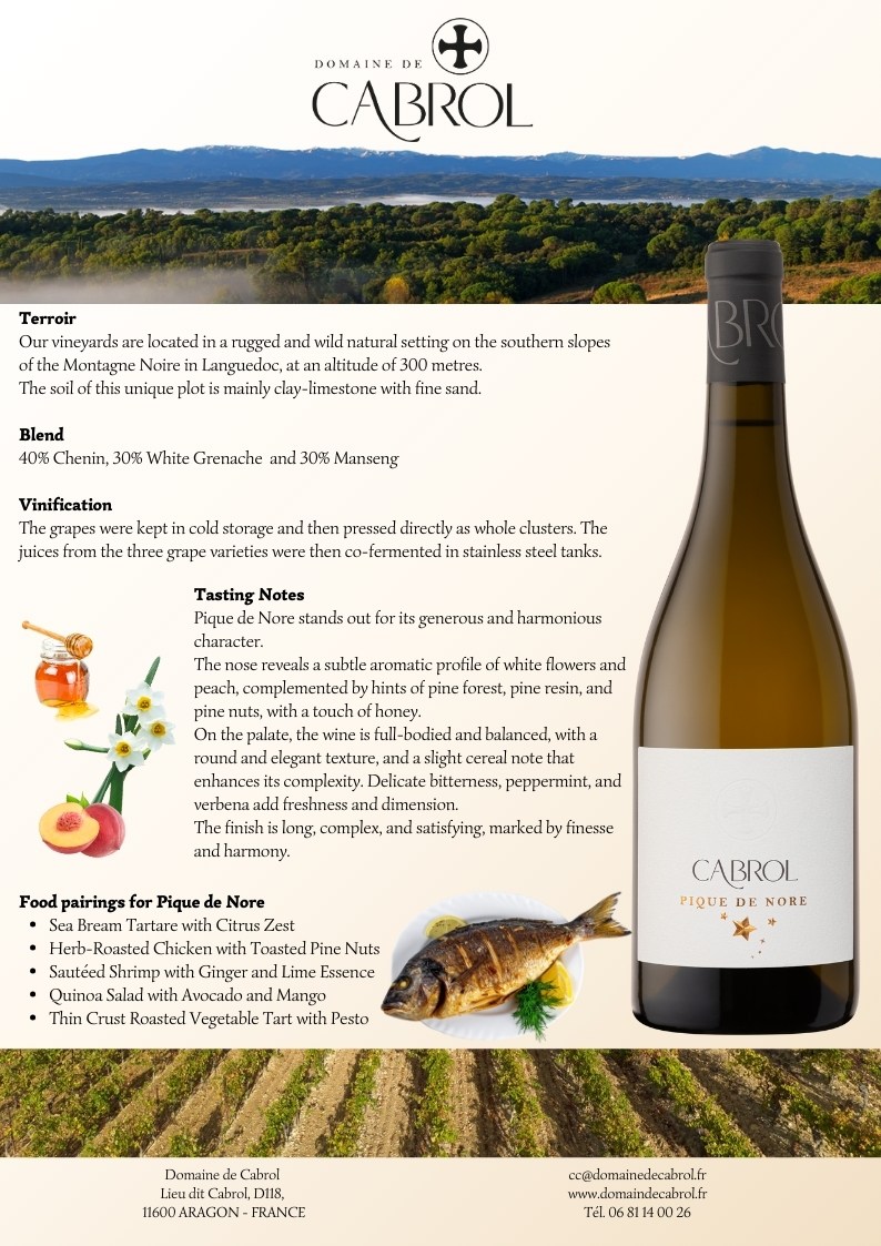 Pique de Nore is a dense wine with delicate aromas, minerality, mid-palate salinity and a lovely, fresh finish, like an ode to the Montagne Noire and the audacity of the little fairy named Nore who created it.