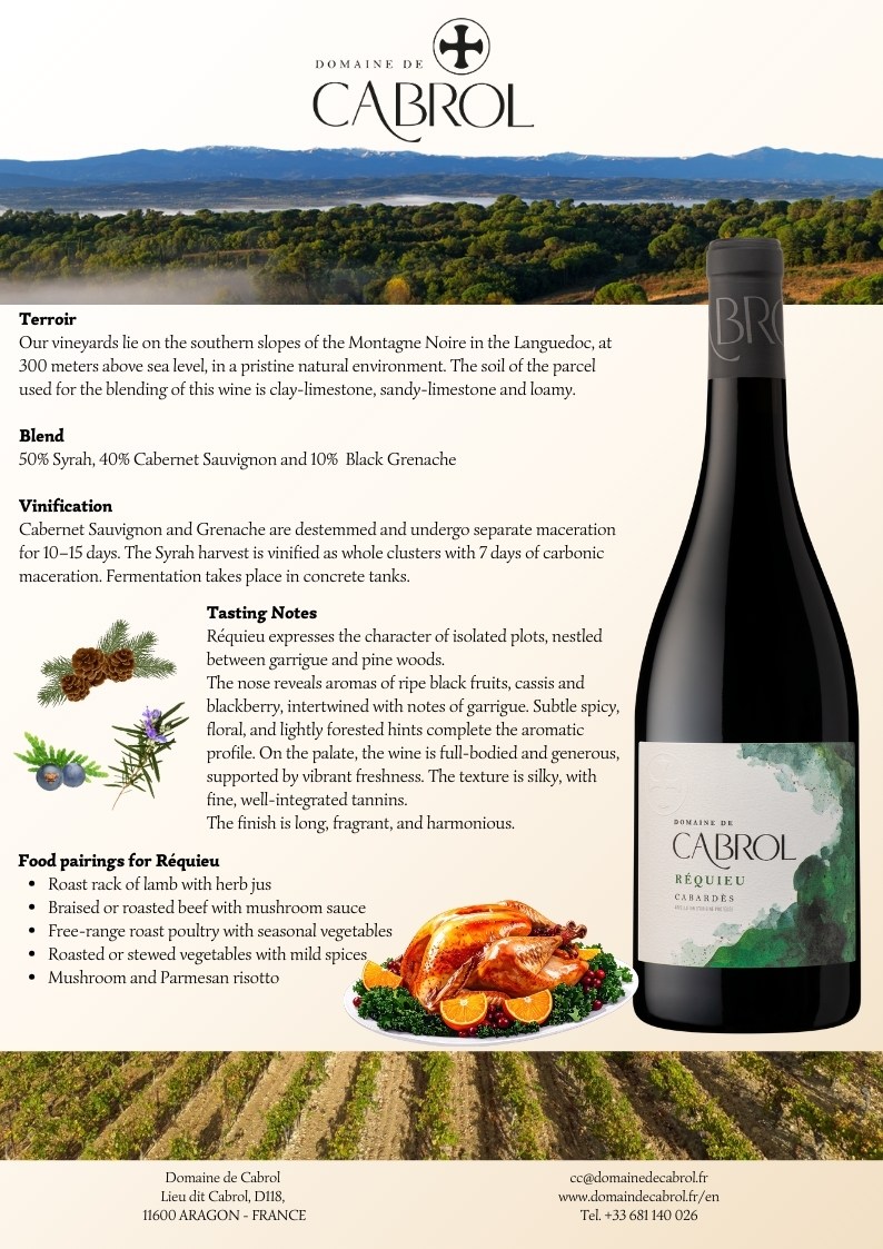 Cuvée Réquieu expresses the character of the isolated plots from which it comes, between garrigue and pine woods. Generous, Réquieu combines Cabernet-Sauvignon with the gourmet flavors of Syrah and Grenache. This cuvée offers a typical first expression of our terroir in the high Cabardès region of the Montagne Noire. Phenomenal value for money. For more information on this wine, please download the tasting notes below.