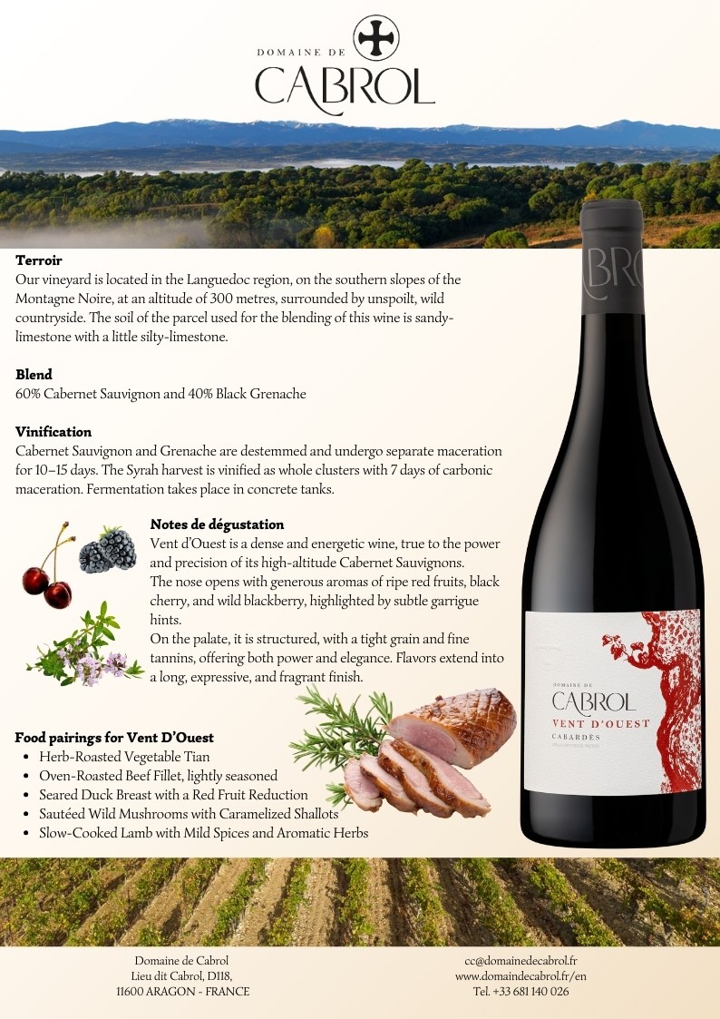 Cuvée Vent d’Ouest has the energy and density of our high-altitude Cabernet Sauvignons. It’s a dense wine with fine tannins and generous red fruit aromas. It is classic, with a tight grain and black cherry flavors. It’s also natural, with wild blackberry and garrigue aromas. And great cellaring potential (15-20 years).