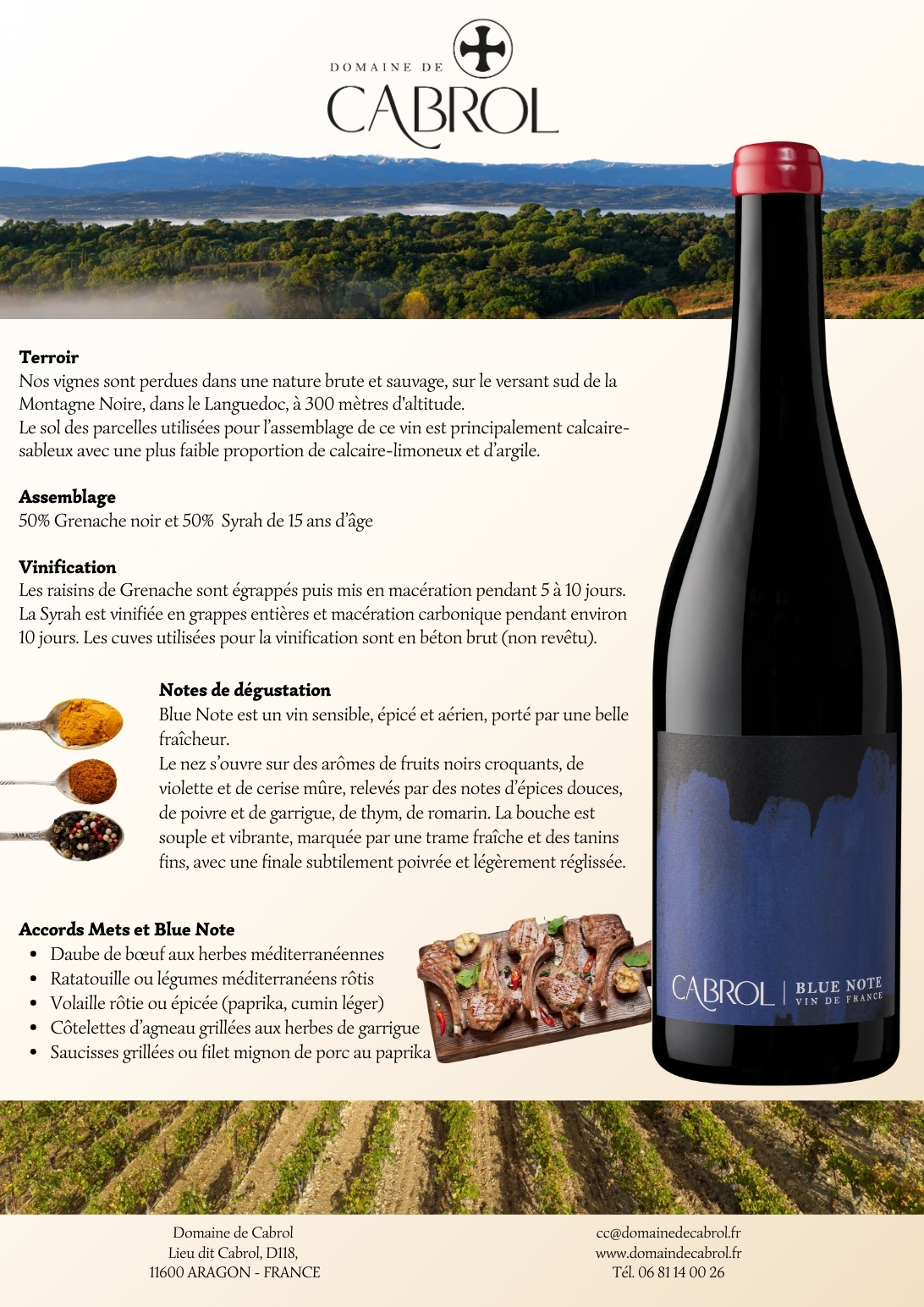 Blue Note est un vin sensible, épicé et aérien, issu de Grenache et de jeunes vignes de Syrah à faibles rendements et cultivés en coteaux. S’il évoque la joie, comme une nuit d’été entre amis et en musique, Blue Note n’est jamais superficiel. Il sera toujours un bon compagnon pour les moments festifs et de partage.
